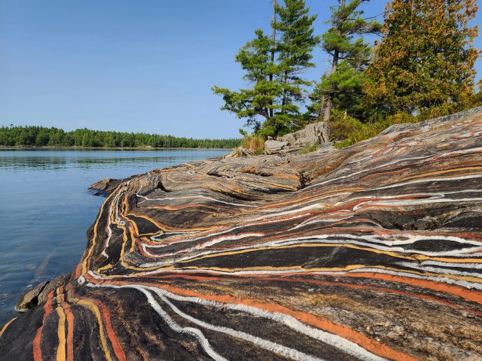 Just north of Peterborough, the land offers up a startling mineral vocabulary: glinting mica, bruised ochres, black granite, quartz that seems to catch and hold light. This is ancient ground, part of a Precambrian formation forced upward through volcanic, tectonic, and glacial upheaval over vast spans of time. It is also a landscape marked by intervention—mining cuts, blasted highways, and the familiar blunt-force signatures of human industry. Yet even under that pressure, the land remains active: crossed by water, insects, roots, and slow natural processes that continue to write their own compositions on the surface.